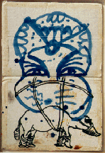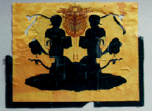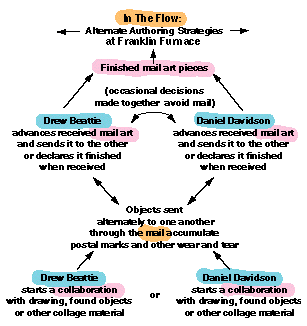 I talked with Daniel Davidson and Drew Beattie about their mail art after their show at Helman Gallery of large scale paintings made with an "ink blot" technique. My interest in their work for In The Flow comes not only from their commitment to collaboration and mail art as alternate authoring strategies, but also their attempt through the working process to develop new metaphors of the self in the imagery. In fact their idea of mail art is quite removed from the network-as-medium espoused by the Mail Art movement seen elsewhere in this exhibition. For Beattie and Davidson the mail acts more as a method to reduce their self-consciousness and preconceptions about a developing piece of art than to counteract the commodifying pressures of the art world. Key to their exploration of identity is the function of collaboration to release them and their audience from expectations of a single unified vision. As Beattie said in comparing their collaborative style with Gilbert and George, "The model for it was much more a kind of brain chatter. Not chatter in the derogatory sense, but just the multiplicity of things that anyone holds at a given moment in their self, their non- self, brain, soul, whatever you want to call it. We wanted to let that spill out in a way that would combine a lot of different things. " And Davidson, "The results for us just came in a more innocent or intuitive way. Less predetermined. We were thinking: What can we find together? What could we make together? Let's see where it goes...""