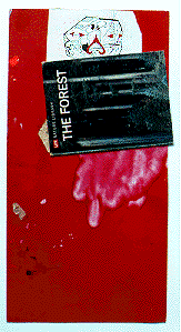 Beattie:       For instance, this piece of mail art has a collection of found, chance things: It's got this "Forest" book cover plowed right on to a red object from a Utrecht store display with a stain on it, a sort of cartoon that's been cut up and drawn over--and these things don't really cook down into a harmonized whole. They talk to one another and coexist with one another, and perhaps provide some kind of circuitry of stations along its loop that becomes a piece of work. Then again, maybe not. That's the gamble. Maybe not.