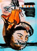 Beattie:       While we want this floating world of multiple reference, multiple identities--that operates in tension with a funny kind of melancholy. Often pieces are organized so that there comes to be a dominant character or two [e.g., 'Duck Boy'] which ride over and above the floating world of possible choices. There is a contradiction in what we do--between inviting multiplicity and wishing there was sometimes a more organizing presence which might be one of these larger characters. It's an analogous tension to the one you talked about before between these ideas about authorship and multiplicity, versus the traditional means of making a pictorial, painting-world.