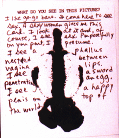And so on. Imagine now a three dimensional model in which all these fields of signification are stacked. Or, for a slightly less theoretical exercise, imagine the night Parnes spent at the Baby Doll, asking customers to free associate about ink blots, distributed in the form of small, black-on-red cards. Comments were written in the margins, as for example "I look at it and, of course, I see sex." Well, wouldn't you? Freud thought you might, and Parnes too, as this respondent clearly knew, adding that the sex is visible there "Purposefully on your part, I presume." But not everyone saw it that way. One customer, in point of fact, saw art ("Elergy to the Spanish Republic," he labeled the blot, as if for a Motherwell with a sinus problem). Another saw a less agreeable form of disingenuousness ("A feeble attempt to be deep.") And then -- let's not forget this is a drinking establishment -- there were slightly less cogent remarks, about cave men's clubs, hamburger buns, elephants' trunks and more, most of it also, naturally, about human bodies and their business. In addition to passing around the ink blot cards, Parnes asked customers