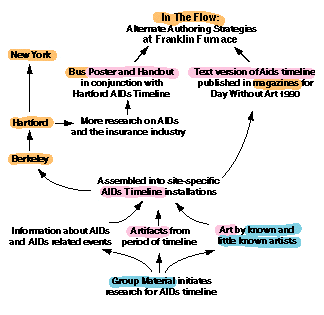 In the Democracy project for the DIA foundation, 1988, installations on education, electoral politics, cultural participation, and AIDS were tied closely to round table and town meeting discussions which were later compiled with other writings into a book. After this project, Group Material work on AIDS continued in the development of the AIDS Timeline first installed at Berkeley in 1989.