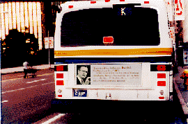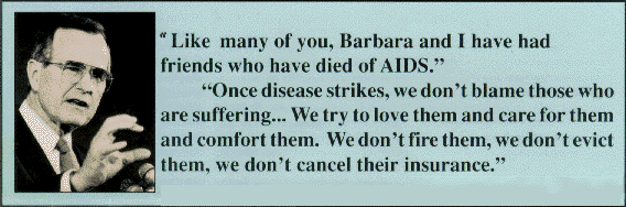 For the bus poster, Group Material addressed the Hartford location by focusing on the insurance industry based there. An image of president Bush with a quote referring to insurance coverage of people with AIDS conveyed positive norms of behavior at odds with the actions of the administration in Washington. While it was left up to people who saw the buses to interpret the sincerity of the quote, a pamphlet about the insurance industry and AIDS written by Mary Anne Staniszewski was also distributed by Real Art Ways to tie in with the poster publicity.