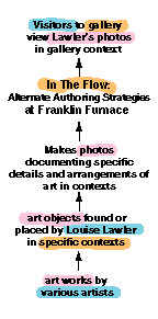 By using art works as her subject matter, the originality of visual content which is the traditional source of value in art images is de-emphasized in favor of this more documentary mode of presentation; the unique appearance of her subjects is already the province of the original artists. Yet unlike a "disinterested" observer/reporter coming to a situation to record what they find, as an artist, Lawler's attention to art makes her anything but disinterested. Her brand of expose' is undoubtedly that of an insider. Often, indeed, the artworks photographed are by artists whom she knows personally, and the access she obtains to private collectors' homes (e.g. a Matthew Barney in a bathroom) presuppose a measure of acceptance by the owners of her and of the attention which she trains upon these settings. Since its beginnings, the relationship of Conceptual Art, of which Lawler's work is certainly a constituent, to the market and institutional participants which are generally called the "art world" has been the major fulcrum against which its content is leveraged. What began as a concerted attempt to "dematerialize" the art-object was rapidly embraced by dealers and collecting institutions as a rich source of documents easily preserved, transported and exchanged in the traditional channels once the notion of acceptable content was updated. And despite the implicit adversarial nature of dematerialization to commodification, the artists--who, after all, had to make their living and find audiences for their endeavors somehow--did not repudiate this embrace. Thus as Conceptual work evolved in the 1980's to address mass-media, gender, ethnicity and other aspects of the economic/political power structures of post-industrial society, it did so with a certain self-conscious irony as to the sources of its own sustenance. In this way, the very lucidity of Lawler's images which suggests a "just the facts Ma'am" approach obtains an element of irony in the privileged views dependent on Lawler's acceptance by and knowledge of the art world milieu which it reveals. This is a basic element of "Appropriation," the branch of Conceptualism to which Lawler's work is sometimes linked; things which appear to be "just what is seen" (e.g. photos of art works in context) have extra layers of meaning from the intermingling and confusion of objective and subjective frames of reference like the multiplication of images produced by mirrors facing one another. Regardless of the repercussions of privilege on the practicality of such art work as a critique of its own milieu, the primary shift of esthetic away from the valuation of originality of visual content toward a deeper awareness of the context in which visual information is received and interpreted sets Lawler's authoring strategy (and those of other artists working in related methodologies) apart from traditional artistic conventions. The subjects of representation , i.e., art works of other artists, taken as found rather than newly created entities become metaphors of identity in a world where the touchstones of originality such as authenticity and newness are diluted by the rapidity of their generation and dissemination through the industries of fashion, entertainment, and advertising--industries honed to cultivate and appeal to markets of mass consumption rather than individuals making their way in life. And the value of these touchstones are read as exchange value and indexed references (e.g. in the auction house and the museum) rather than as a product of direct contact and personal experience.