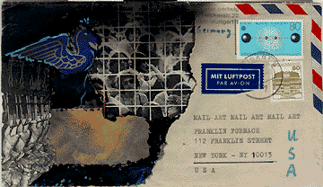 I was very fortunate to curate some of the memorials dedicated to Art and Artists gathered around Ray Johnson. For example the "Grandma Moses's of the Underground" at the Buecker and Harpsichords in Soho and several "Ray Johnson-fan club" international mail art shows. All of them were a pretext for a reunion of the Legends of the Avant Garde headed by octogenarians, dadaists, and surrealists like May Wilson, Lil Picard, Sari Dienes, and Charles Henri Ford, Ed Plunkett, Ray Johnson and Cavellini. Beside its historic and aesthetic value mail art proves also to be revolutionary. The illegal connection with Romania, Yugoslavia, Hungary and Poland continues until today. Unfortunately we must use private and unofficial messengers and sometimes even diplomatic briefcases or black market "mules" to smuggle correspondence art, antique books and underground writings. For example, the show on Dadaism and Surrealism from Romania, presented in 1980 at Franklin Furnace, featured over 100 artifacts and books smuggled out of Romania over a 12 year period simply because the government banned these books and was holding them under lock and key. With the help of courageous mail artists: "1906-manifestos" written by Tristan Tzara arrived in this country. Valuable drawings by Marcel Janco, Brancusi, and Victor Brauner were shown for the first time ever thanks to anonymous heroes. Thus mail art becomes a force of defiance, resistance, and experimentation. The most common technique to cover the trail of a secret mail art message is re-mailing it using Ed Plunkett's slogan, "please zen to." The receiver just adds his or her contribution the message, rubber stamping it, collaging it, and finally re-posting it to the next mail connection.
