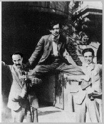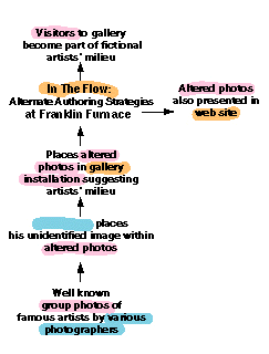 Autonomy and the search of the self Life as the never ending search for the self. The endless definition and redefinition The inscription of the self "say to oneself".......(as in Roland Barthes or Felix Gonzales-Torres textural portraits) Self then as description: the ultimate code The conceit of the photograph in self-portrait, portrait and group portrait: as the superficial morpho-magical rendering of the momentary self, caught in the intersticies between I,Me, You, and them. Naming, name, signature, title. Anononymity as either, a resistence to or succumbing to this obsessive need to know and identify and catagorize. Duchamps' barber was the only person who was aware of who he was is the coy outflanking of the art worlds desire for fame and identification. whisper.......(thus signature) as if this identifiable persona later materialized into an indexical marker impressed upon the work of art iself, as a coordinated signifier of worth. As if, within the micro-cultural context of the art world, the society of the artist and the artist's society are one. the artists ability to function in one or both, by either, acceptance or denial a sign of greatness. like the religious leaders of Czarist Russia, hypertext.....(referred to by Tolstoy). whose true greatness is revealed only after death when the sweetness of the odor of decay is directly proprtional to their inner purity and thus their true sacredness. And it is to this art society that unknown artist is directly focused. whisper......(Iam always interested in looking at group portraits of famous artists). From sitting around a kitchen table drinking and carousing at a bar meeting at an opening there is a certain nostalgia that these images impart. A kind of loss for times unrecoverable when artists worked together believed in the function of art controlled their own destiny. Whether in fact this was the case is not the issue. Their world may not have differed much from today. But the past and the photos of the past impart a warm glow. inspecting these images one finds the unidentified artist or person included. Was he or she somone's friend who just happened to be there, was he or she some one history chose to forget. Our gaze transfixed by a mystery that shrouds this indefinable entity memorialized by the camera. said to onself....(Unknown Artist lionizes this quixotic figure by attempting to negotiate his or her obscurity.) with the flick of the computer brush a superimposition of one figure for another is accomplished A visual game is created it becomes amusing to find the unknown artist. Like Eloise at the Plaza or Where's Waldo, the viewer is prodded to find and search for the unknown artist rather than doing the more familiar chore of recognizing the famous ones. visual perceptual processes are deconstructed reorganized around different fundamental principles. New neurobiological tranitory flux which is consciousness is momentarily disrupted. Warren Neidich 1996, New York